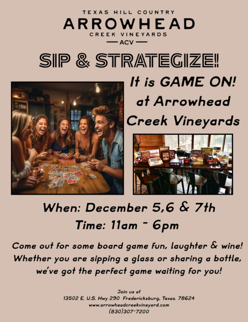 Sip & Strategize @ Arrowhead Vineyards13502 E. U.S. Highway 290