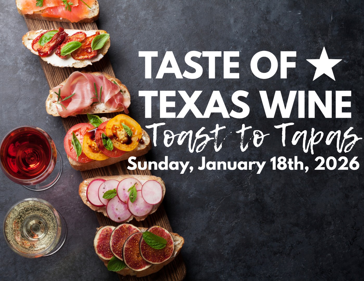Join us for a flavorful Toast to Tapas and Texas Wine! Sip, snack, and learn as we take you on a delicious tour of Texas wines, each perfectly matched with tasty chef-crafted tapas. Texas Wine Collective will pair six of our wines with a variety of tapas that highlight local ingredients and flavors. We’ll chat about flavor profiles, pairing tips, and fun wine facts as you taste your way through the lineup, making it perfect for wine lovers, foodies, and anyone just looking for a great time.