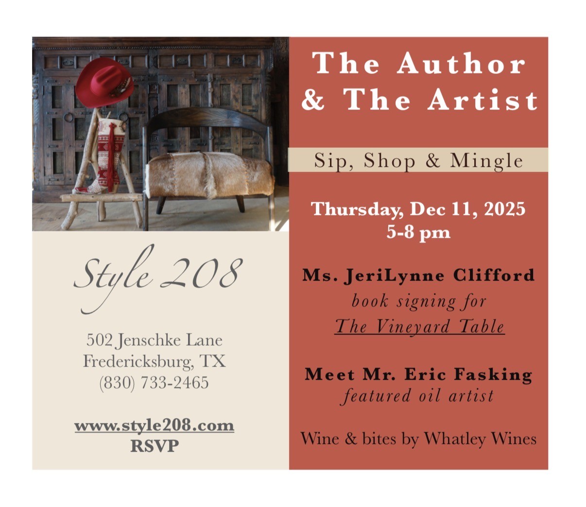 Come browse our beautiful showroom full of rustic elegant furniture, decor, holiday gift baskets, our custom boot bar and more! Ms. Jerilynne Clifford will be signing copies of her Hill Country Cookbook “The Vineyard Table”. Our very talented featured artist, Mr. Eric Fasking, will be here to talk about his 17 masterful works offered in the Style 208 gallery. Wine and bites provided by Whatley Wines. Come shop, sip and mingle. 10% off storewide.